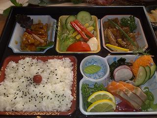 お刺身、豚肉のしょうが焼き、鶏の照り焼き等に加え、お味噌汁まで付いてるお弁当。
