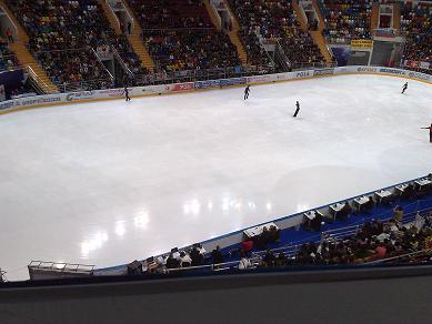 その後アイスダンス、ペアと続き、最後に男子フリー。これはその男子競技前の練習風景。